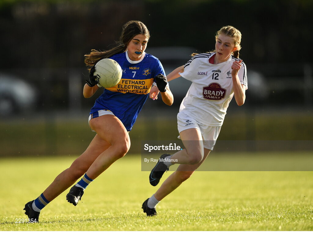 13 July 2022; Ellie Franklin of Tipperary in action against Abaigh Cahill of Kildare during the 2022 All-Ireland U16 B Final between Kildare and Tipperary at Crettyard, Co. Laois. Photo by Ray McManus/Sportsfile