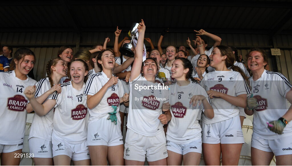13 July 2022; Kildare captain Zara Hurley, 3, and her team mates with the cup after the 2022 All-Ireland U16 B Final between Kildare and Tipperary at Crettyard, Co. Laois. Photo by Ray McManus/Sportsfile