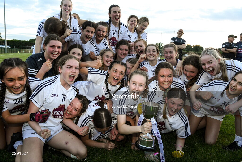 13 July 2022; Kildare's Caoimhe Egan and her team mates with the cup after the 2022 All-Ireland U16 B Final between Kildare and Tipperary at Crettyard, Co. Laois. Photo by Ray McManus/Sportsfile