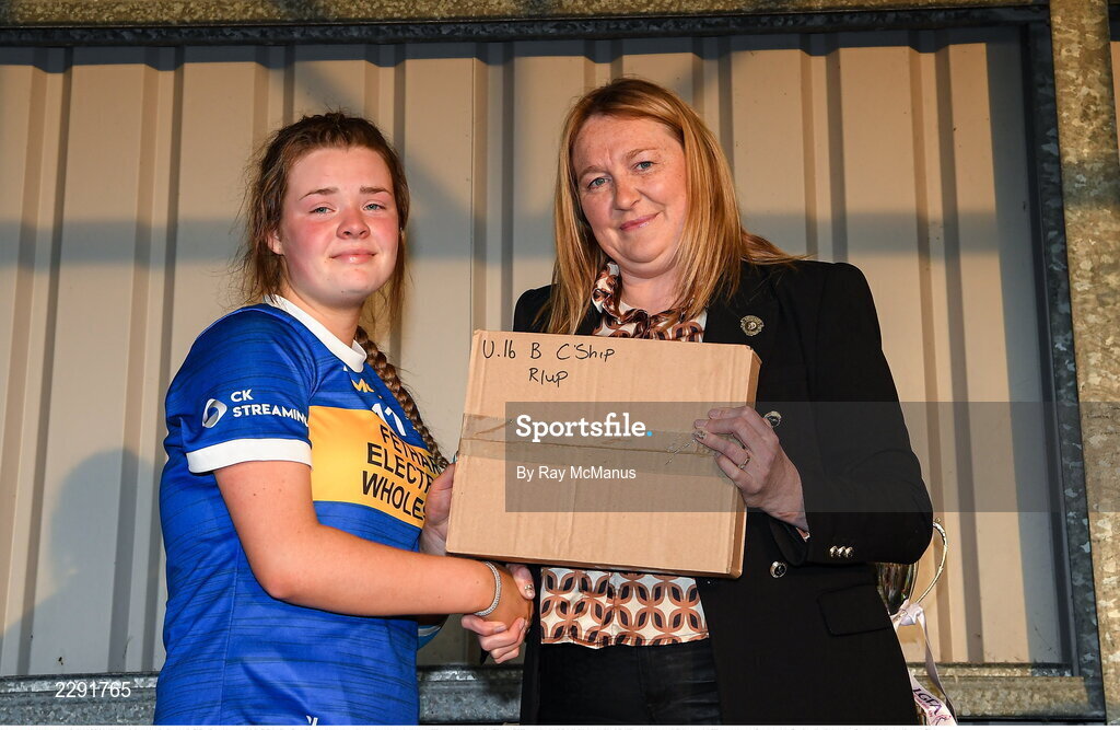 13 July 2022; Trina Murray, Leinster LGFA President and LGFA vice-President, presents the runner up medals to Tipperary captain Ciara O'Hora the 2022 All-Ireland U16 B Final between Kildare and Tipperary at Crettyard, Co. Laois. Photo by Ray McManus/Sportsfile