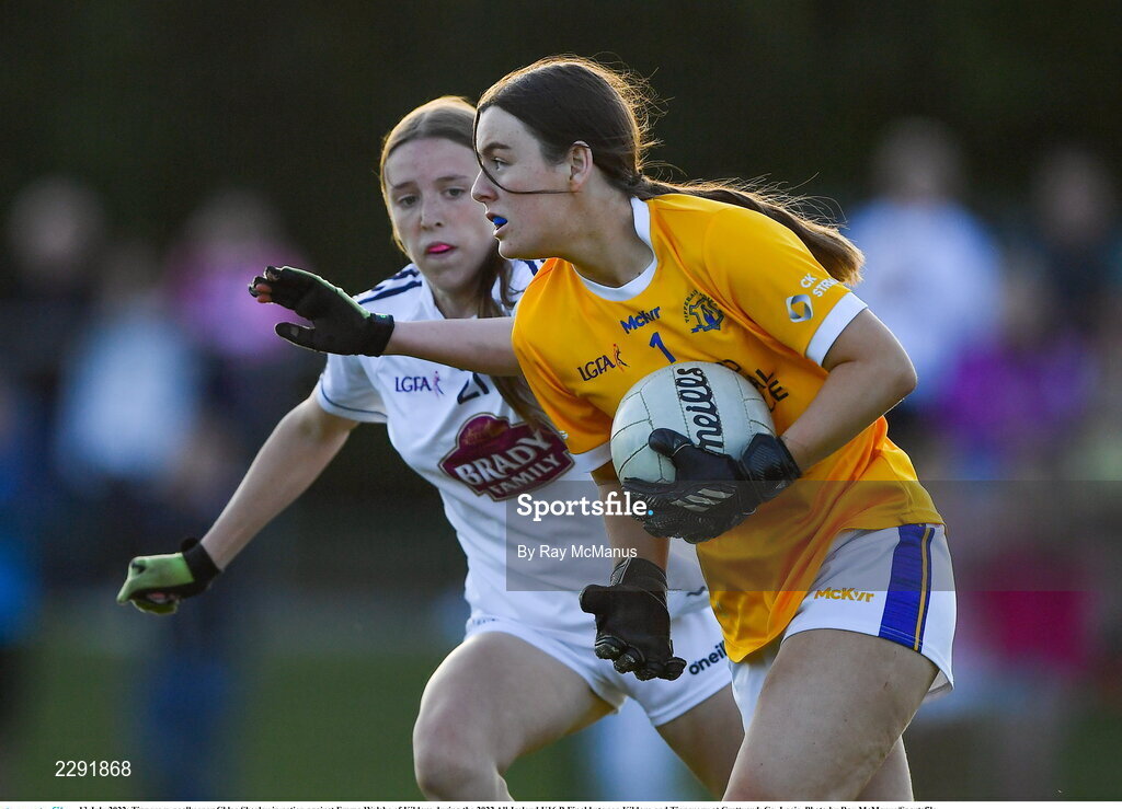13 July 2022; Tipperary goalkeeper Chloe Shorley in action against Emma Walshe of Kildare during the 2022 All-Ireland U16 B Final between Kildare and Tipperary at Crettyard, Co. Laois. Photo by Ray McManus/Sportsfile