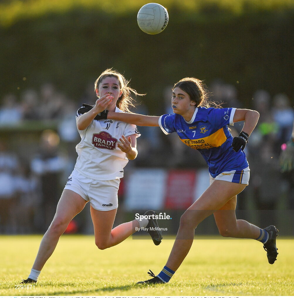 13 July 2022; Abi Whelan of Kildare in action against Ellie Franklin of Tipperary during the 2022 All-Ireland U16 B Final between Kildare and Tipperary at Crettyard, Co. Laois. Photo by Ray McManus/Sportsfile