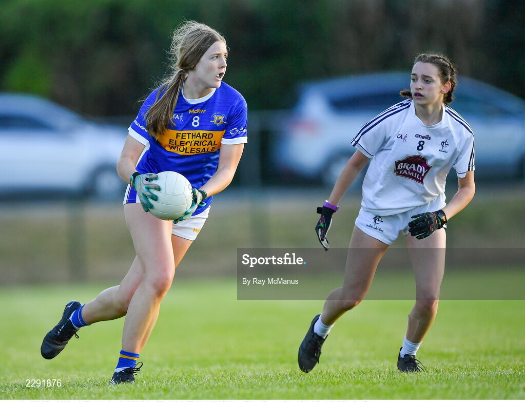 13 July 2022; Aedin McCormack of Tipperary in action against Beibhinn Hughes of Kildare during the 2022 All-Ireland U16 B Final between Kildare and Tipperary at Crettyard, Co. Laois. Photo by Ray McManus/Sportsfile