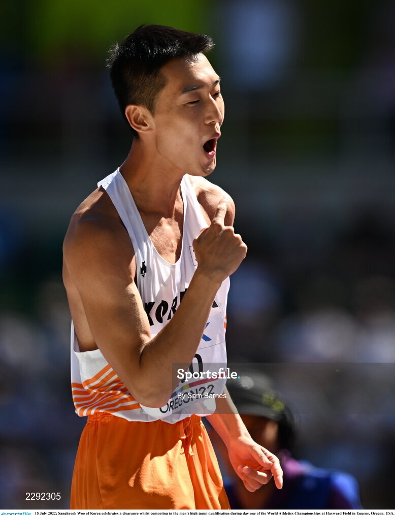 15 July 2022; Sanghyeok Woo of Korea celebrates a clearance whilst competing in the men's high jump qualification during day one of the World Athletics Championships at Hayward Field in Eugene, Oregon, USA. Photo by Sam Barnes/Sportsfile
