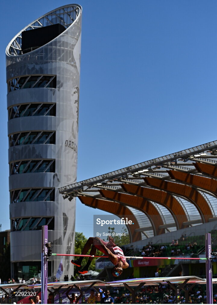15 July 2022; Mutaz Essa Barshim of Qatar competing in the men's high jump qualification during day one of the World Athletics Championships at Hayward Field in Eugene, Oregon, USA. Photo by Sam Barnes/Sportsfile