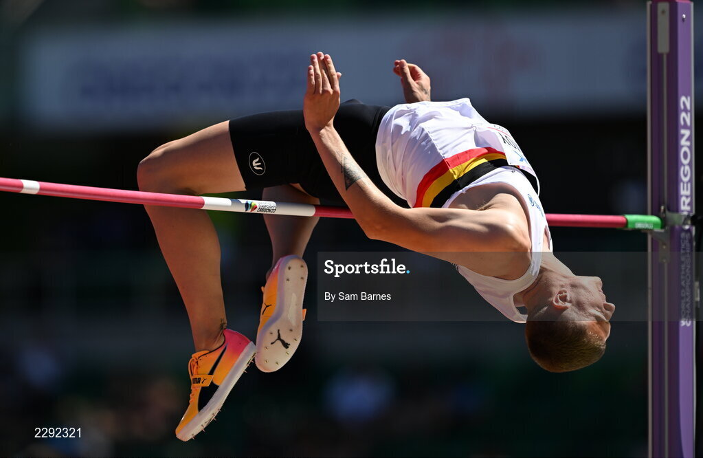 15 July 2022; Thomas Carmoy of Belgium competing in the men's high jump qualification during day one of the World Athletics Championships at Hayward Field in Eugene, Oregon, USA. Photo by Sam Barnes/Sportsfile