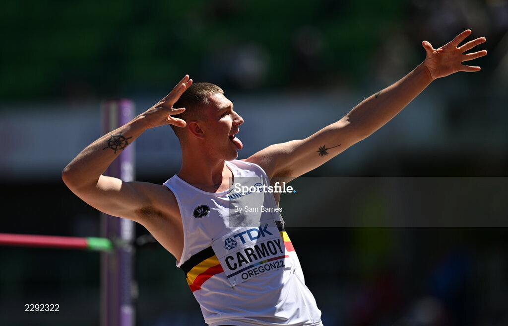 15 July 2022; Thomas Carmoy of Belgium celebrates a clearance whilst competing in the men's high jump qualification during day one of the World Athletics Championships at Hayward Field in Eugene, Oregon, USA. Photo by Sam Barnes/Sportsfile