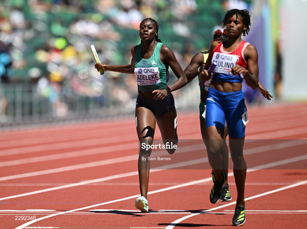 15 July 2022; Rhasidat Adeleke of Ireland crosses the line to finish second in the mixed 4x400m relay heats during day one of the World Athletics Championships at Hayward Field in Eugene, Oregon, USA. Photo by Sam Barnes/Sportsfile
