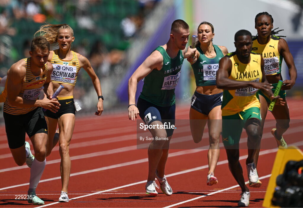 15 July 2022; Jack Raftery of Ireland, centre, takes the baton from team-mate Sophie Becker whilst competing in the mixed 4x400m relay heats during day one of the World Athletics Championships at Hayward Field in Eugene, Oregon, USA. Photo by Sam Barnes/Sportsfile