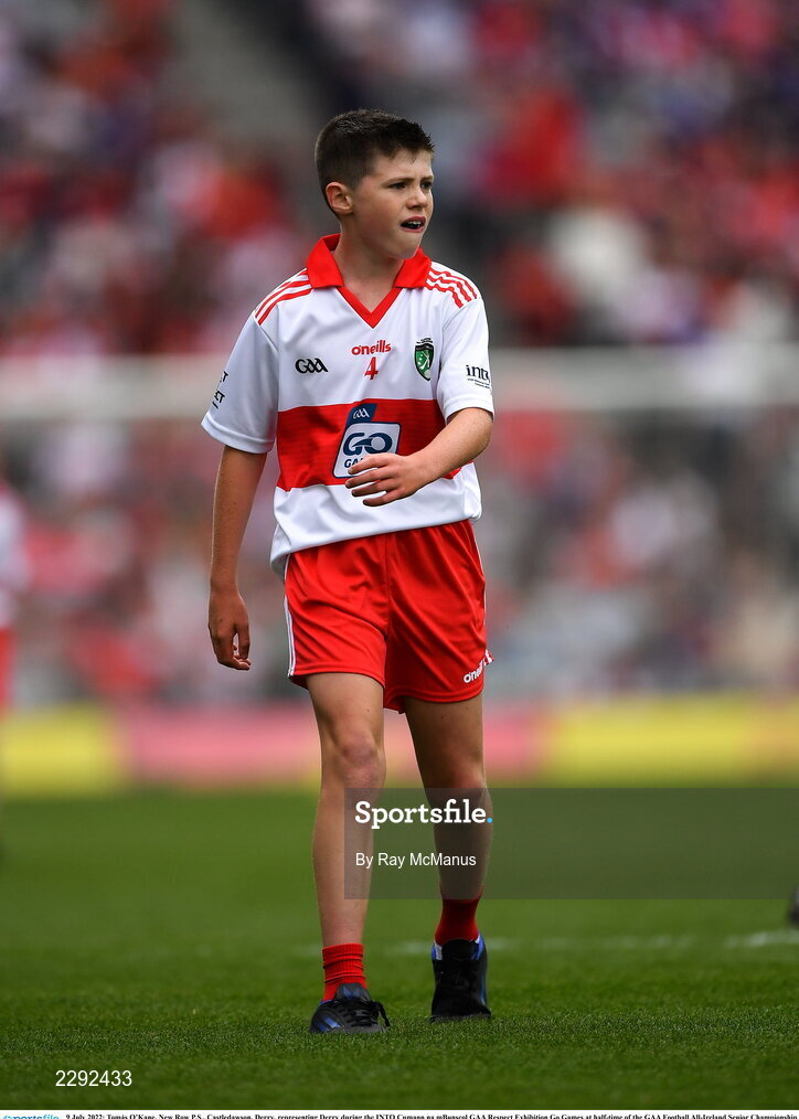 9 July 2022; Tomás O’Kane, New Row P.S., Castledawson, Derry, representing Derry during the INTO Cumann na mBunscol GAA Respect Exhibition Go Games at half-time of the GAA Football All-Ireland Senior Championship Semi-Final match between Galway and Derry at Croke Park in Dublin. Photo by Ray McManus/Sportsfile