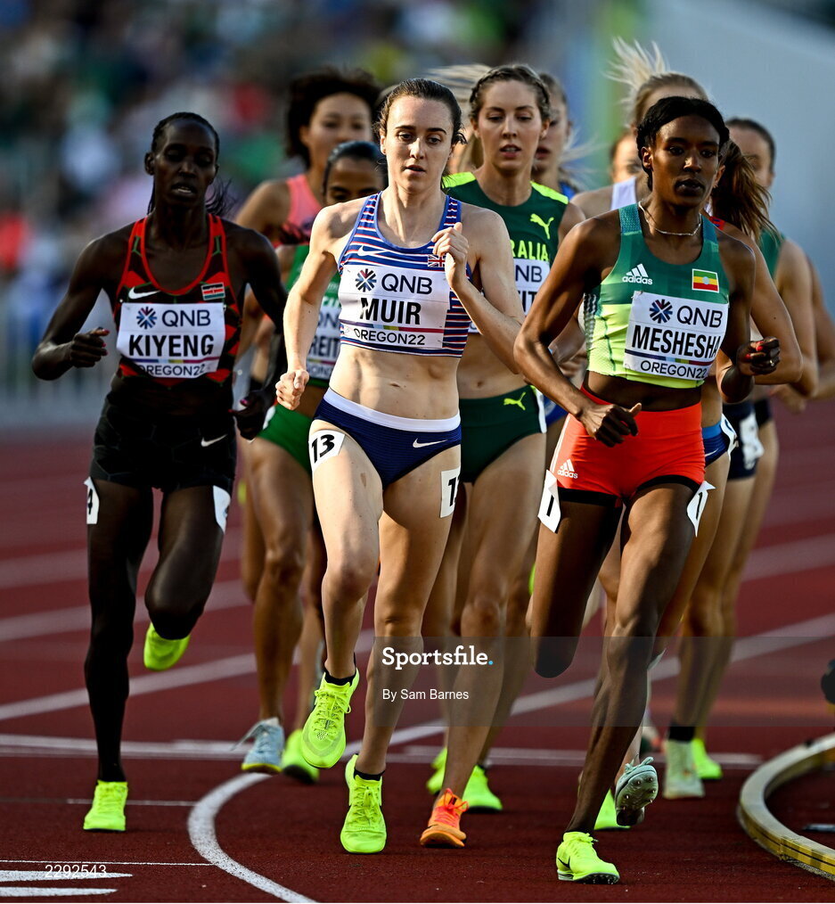 15 July 2022; Laura Muir of Great Britain, left, and Hirut Meshesha of Ethiopia lead he field in their heat of the women's 1500m during day one of the World Athletics Championships at Hayward Field in Eugene, Oregon, USA. Photo by Sam Barnes/Sportsfile