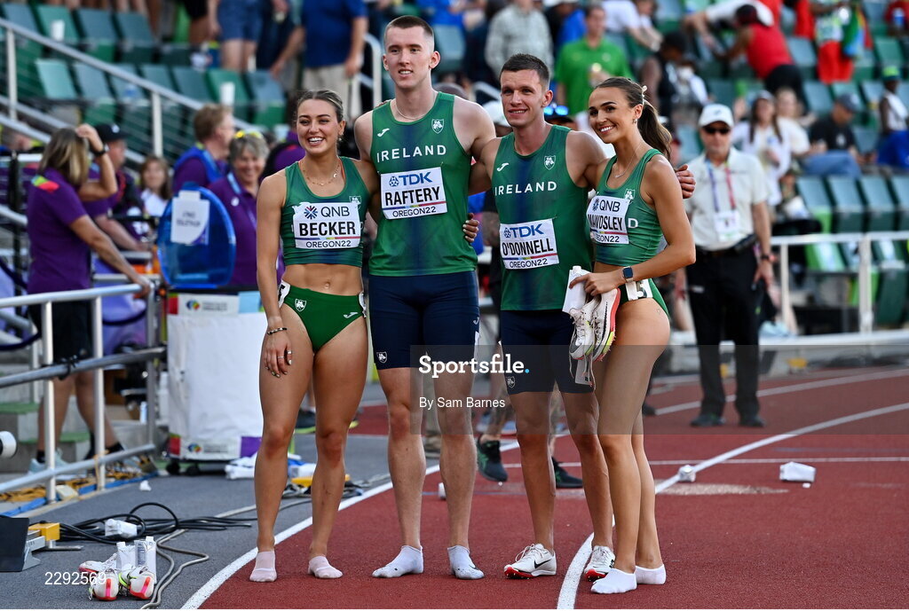 15 July 2022; The Ireland 4x400m mixed relay team, from left, Sophie Becker, Jack Raftery, Chris O'Donnell and Sharlene Mawdsley after finishing eighth in the 4x400m mixed relay final during day one of the World Athletics Championships at Hayward Field in Eugene, Oregon, USA. Photo by Sam Barnes/Sportsfile