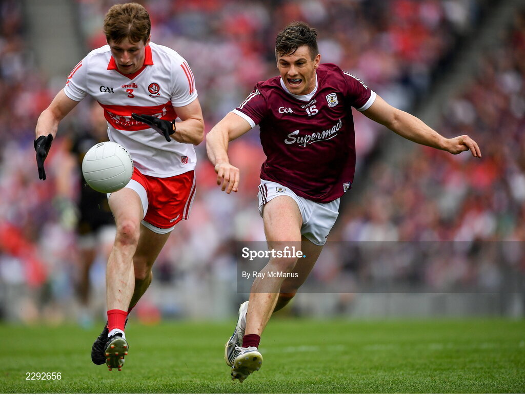 9 July 2022; Brendan Rogers of Derry and Shane Walsh of Galway during the GAA Football All-Ireland Senior Championship Semi-Final match between Derry and Galway at Croke Park in Dublin. Photo by Ray McManus/Sportsfile