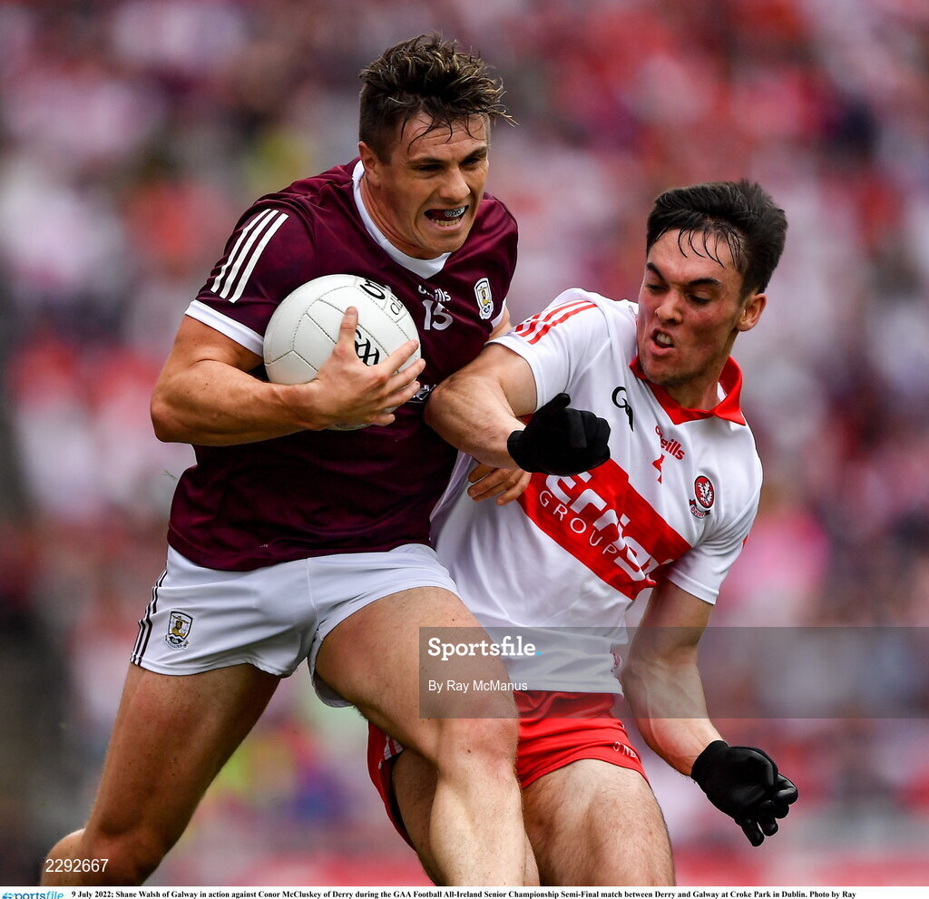 9 July 2022; Shane Walsh of Galway in action against Conor McCluskey of Derry during the GAA Football All-Ireland Senior Championship Semi-Final match between Derry and Galway at Croke Park in Dublin. Photo by Ray McManus/Sportsfile