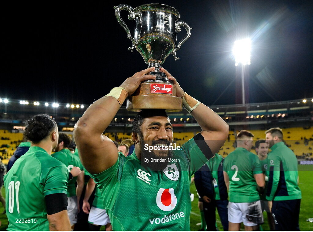 16 July 2022; Bundee Aki of Ireland celebrates with the trophy after his side's victory in the Steinlager Series match between the New Zealand and Ireland at Sky Stadium in Wellington, New Zealand. Photo by Brendan Moran/Sportsfile
