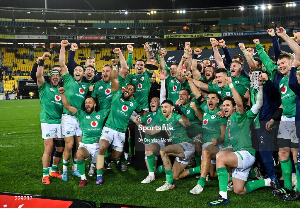 16 July 2022; Ireland captain Jonathan Sexton lifts the trophy with James Ryan and teammates after their side's victory in the Steinlager Series match between the New Zealand and Ireland at Sky Stadium in Wellington, New Zealand. Photo by Brendan Moran/Sportsfile