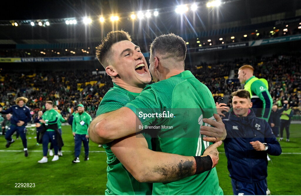 16 July 2022; Dan Sheehan and Jonathan Sexton of Ireland embrace after their side's victory in the Steinlager Series match between the New Zealand and Ireland at Sky Stadium in Wellington, New Zealand. Photo by Brendan Moran/Sportsfile