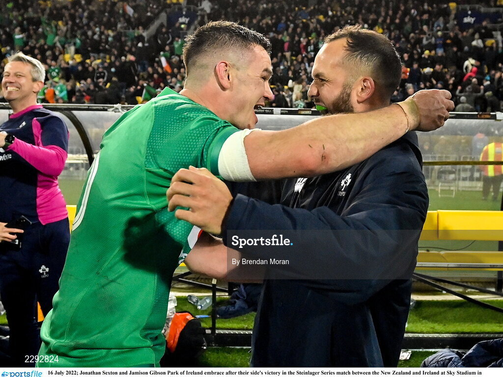 16 July 2022; Jonathan Sexton and Jamison Gibson Park of Ireland embrace after their side's victory in the Steinlager Series match between the New Zealand and Ireland at Sky Stadium in Wellington, New Zealand. Photo by Brendan Moran/Sportsfile