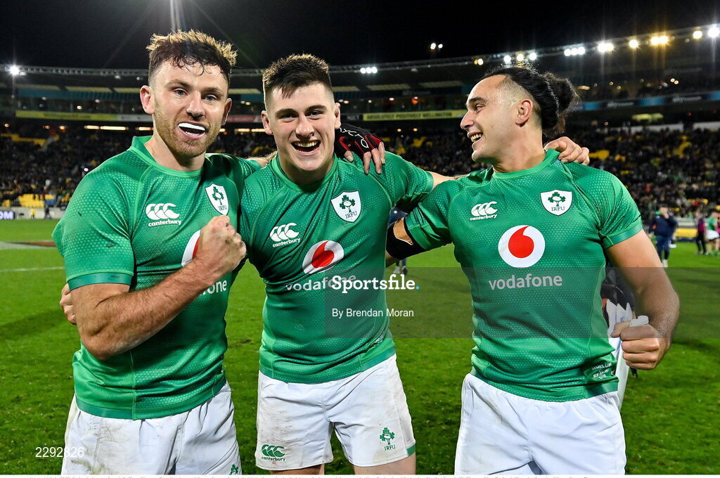 16 July 2022; Ireland players, from left, Hugo Keenan, Dan Sheehan and James Lowe after their side's victory in the Steinlager Series match between the New Zealand and Ireland at Sky Stadium in Wellington, New Zealand. Photo by Brendan Moran/Sportsfile