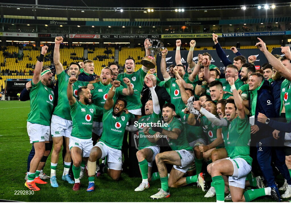16 July 2022; Ireland players celebrate with the trophy after their side's victory in the Steinlager Series match between the New Zealand and Ireland at Sky Stadium in Wellington, New Zealand. Photo by Brendan Moran/Sportsfile