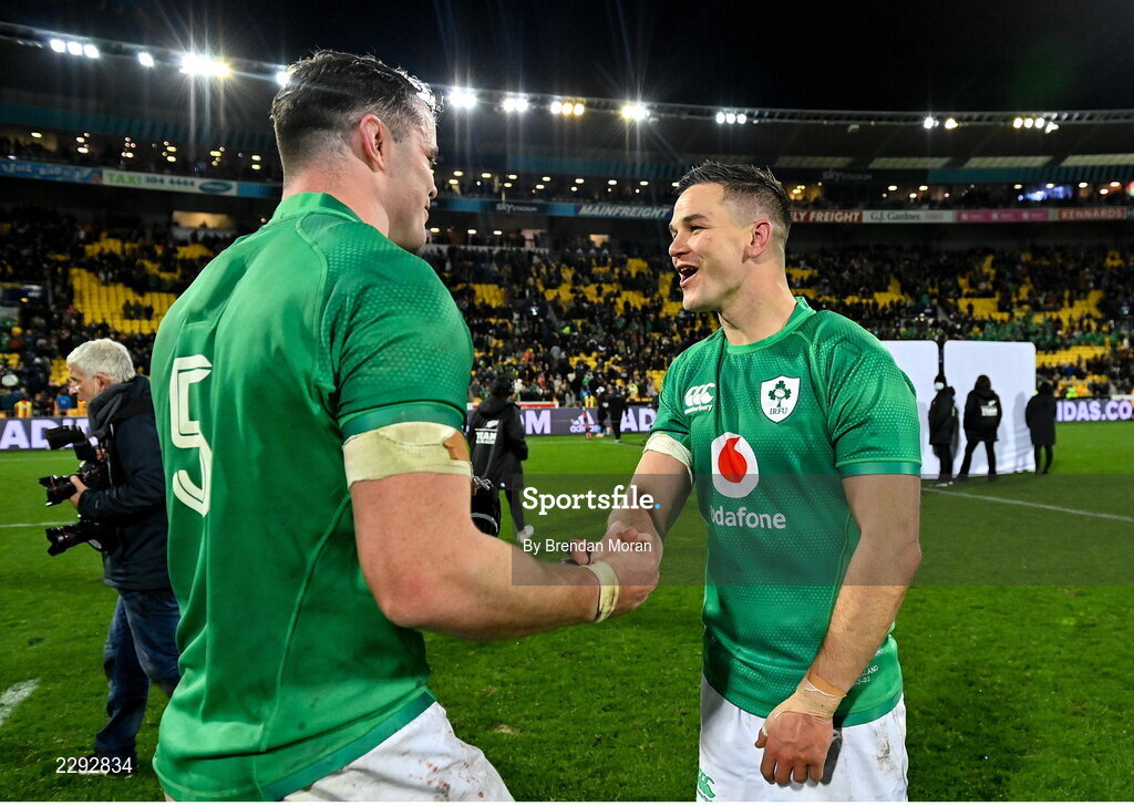 16 July 2022; Jonathan Sexton and James Ryan of Ireland embrace after his side's victory in the Steinlager Series match between the New Zealand and Ireland at Sky Stadium in Wellington, New Zealand. Photo by Brendan Moran/Sportsfile