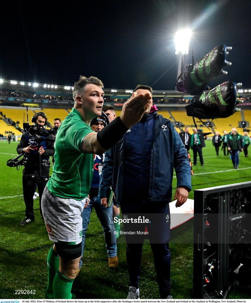 16 July 2022; Peter O’Mahony of Ireland throws his boots up to the Irish supporters after the Steinlager Series match between the New Zealand and Ireland at Sky Stadium in Wellington, New Zealand. Photo by Brendan Moran/Sportsfile