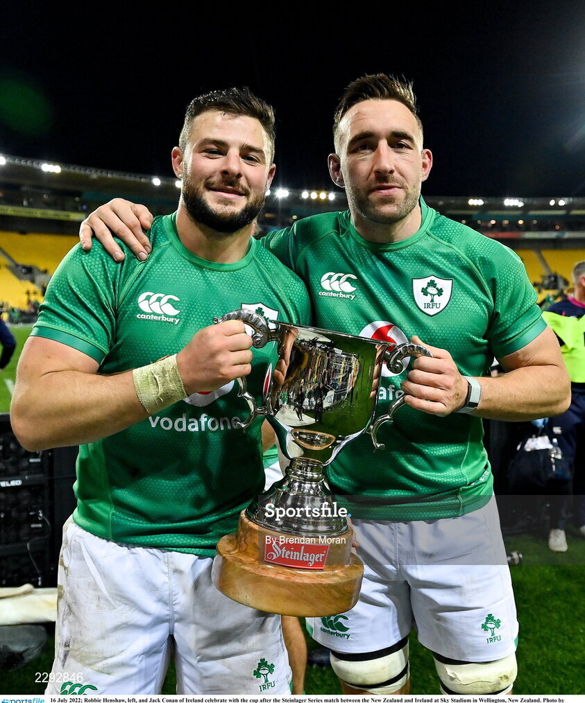 16 July 2022; Robbie Henshaw, left, and Jack Conan of Ireland celebrate with the cup after the Steinlager Series match between the New Zealand and Ireland at Sky Stadium in Wellington, New Zealand. Photo by Brendan Moran/Sportsfile