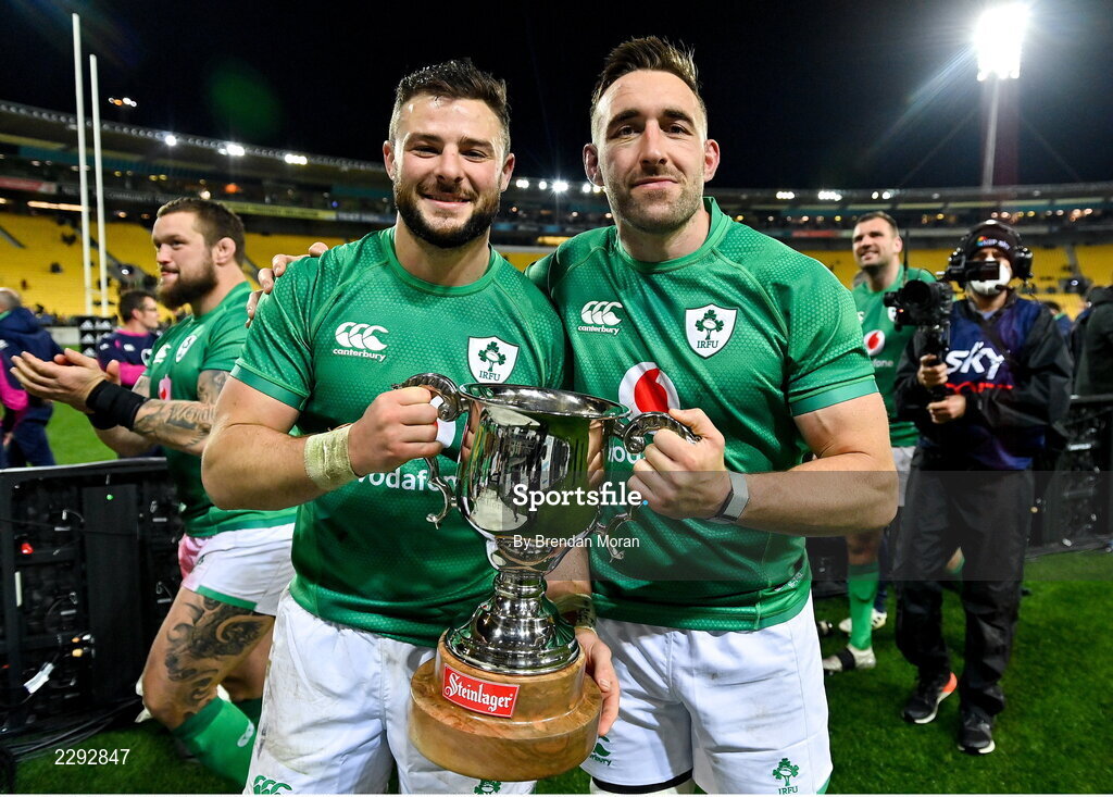 16 July 2022; Robbie Henshaw, left, and Jack Conan of Ireland celebrate with the cup after the Steinlager Series match between the New Zealand and Ireland at Sky Stadium in Wellington, New Zealand. Photo by Brendan Moran/Sportsfile
