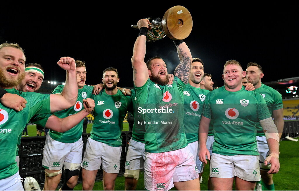 16 July 2022; Ireland players, from left, Finlay Bealham, Rob Herring, Josh van der Flier, Robbie Henshaw, Andrew Porter, Conor Murray, Tadhg Furlong and Jack Conan celebrate with the cup after the Steinlager Series match between the New Zealand and Ireland at Sky Stadium in Wellington, New Zealand. Photo by Brendan Moran/Sportsfile