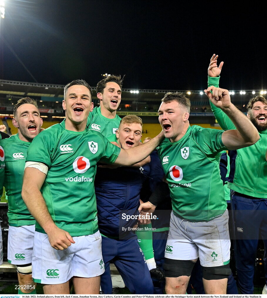 16 July 2022; Ireland players, from left, Jack Conan, Jonathan Sexton, Joey Carbery, Gavin Coombes and Peter O’Mahony celebrate after the Steinlager Series match between the New Zealand and Ireland at Sky Stadium in Wellington, New Zealand. Photo by Brendan Moran/Sportsfile