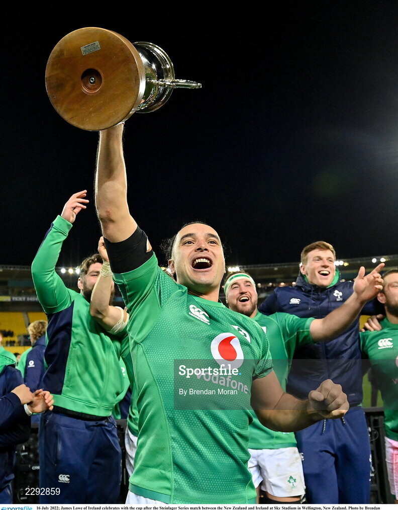 16 July 2022; James Lowe of Ireland celebrates with the cup after the Steinlager Series match between the New Zealand and Ireland at Sky Stadium in Wellington, New Zealand. Photo by Brendan Moran/Sportsfile