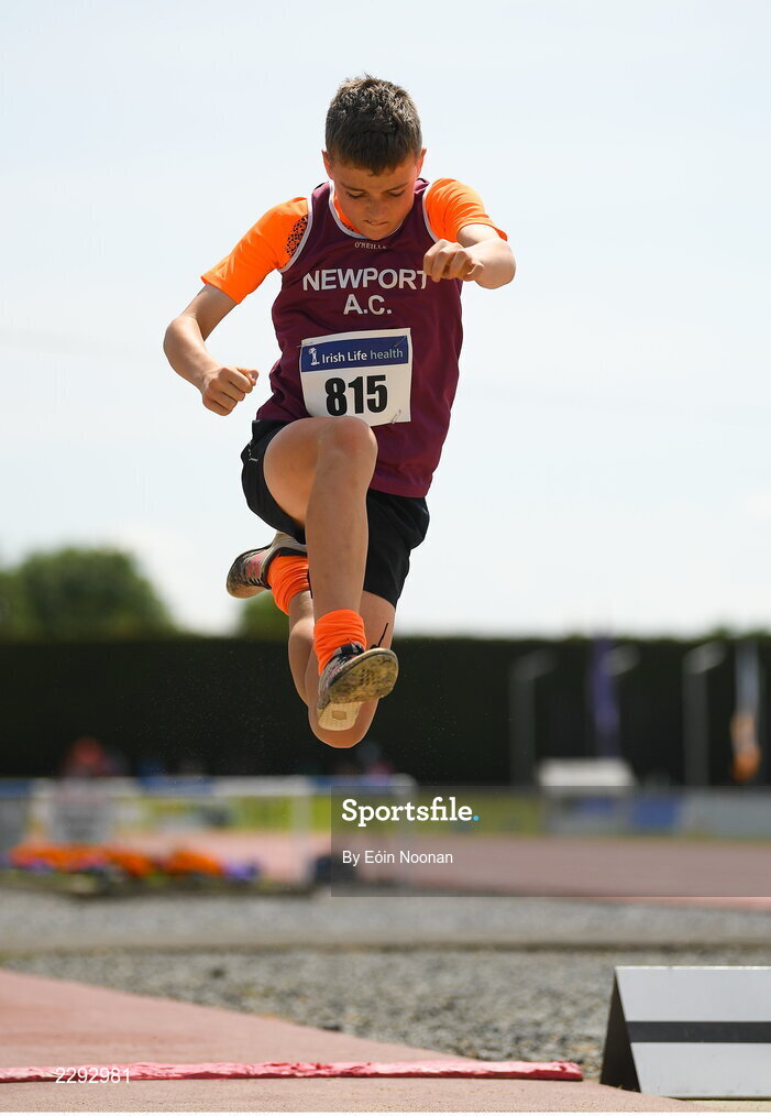 16 July 2022; Colm Ryan of Newport AC, Tipperary, competing in the Long Jump event during in the Irish Life Health Juvenile B Championships & Relays in Tullamore, Offaly. Photo by Eóin Noonan/Sportsfile