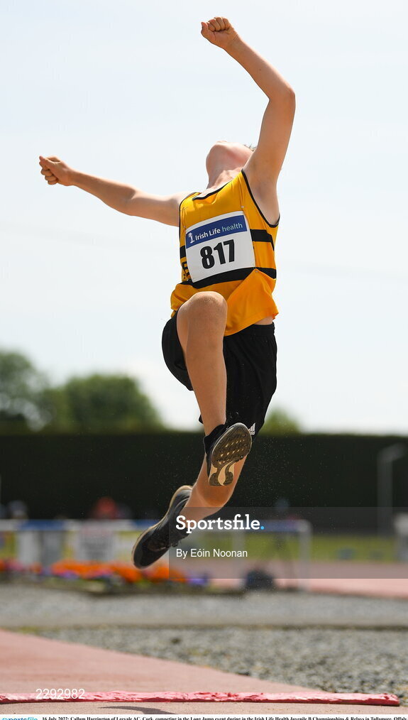 16 July 2022; Callum Harrington of Leevale AC, Cork, competing in the Long Jump event during in the Irish Life Health Juvenile B Championships & Relays in Tullamore, Offaly. Photo by Eóin Noonan/Sportsfile