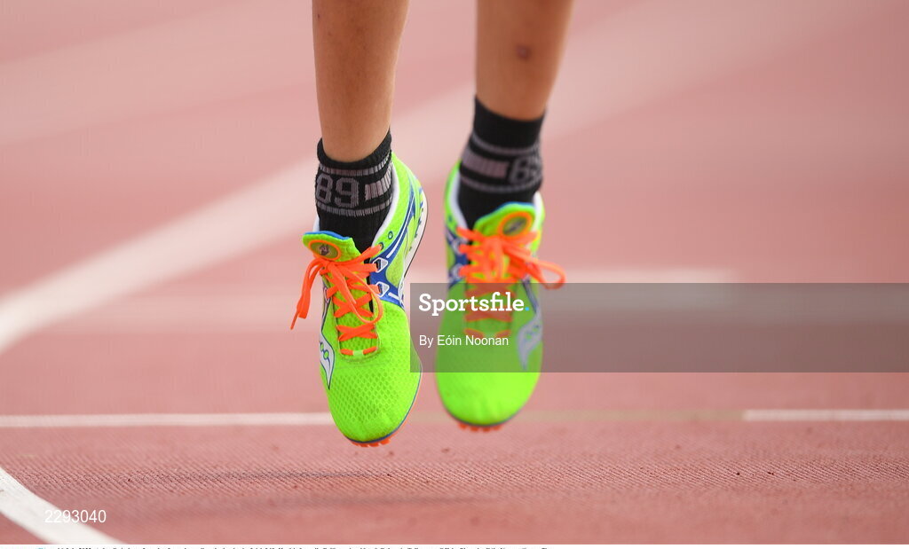 16 July 2022; A detailed view of a pair of running spikes during in the Irish Life Health Juvenile B Championships & Relays in Tullamore, Offaly. Photo by Eóin Noonan/Sportsfile