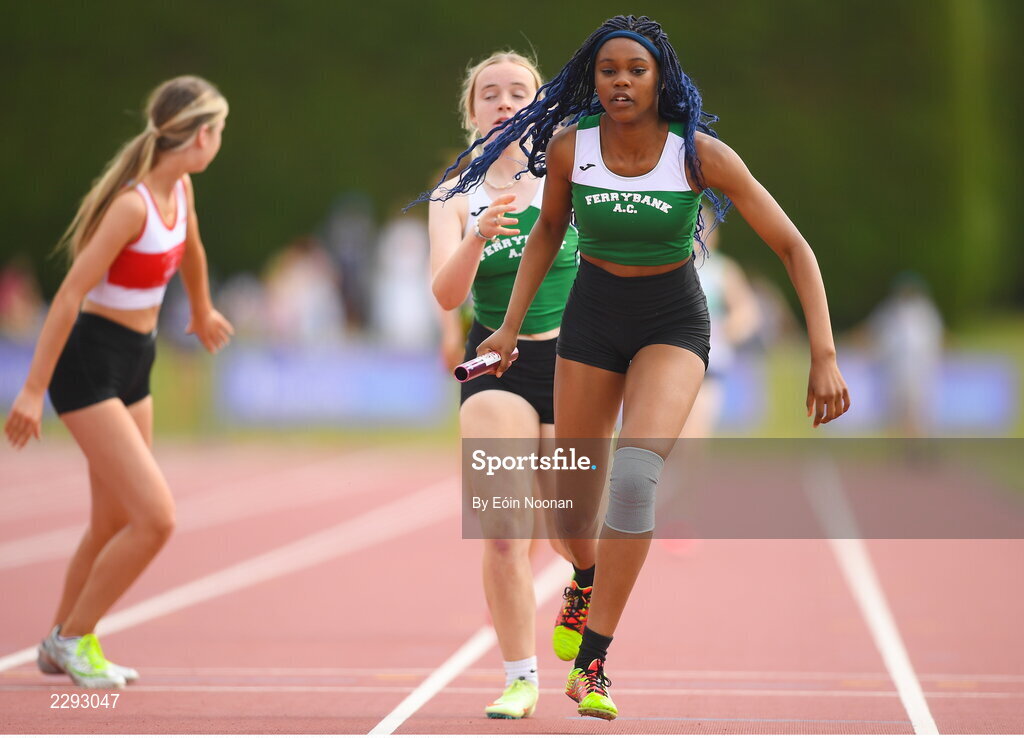 16 July 2022; The Ferrybank AC team competing in the 1600m relay during in the Irish Life Health Juvenile B Championships & Relays in Tullamore, Offaly. Photo by Eóin Noonan/Sportsfile