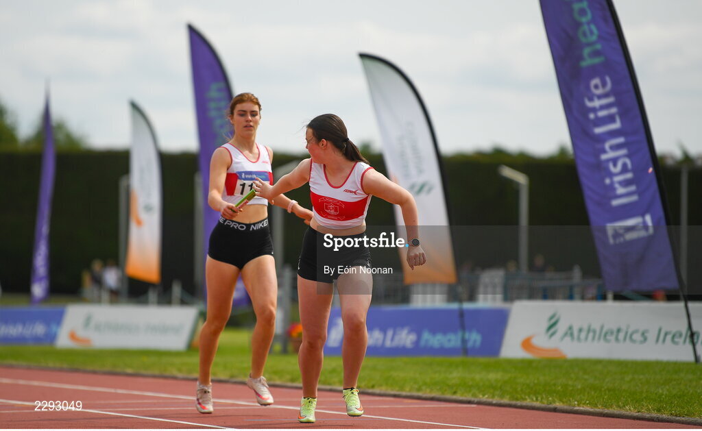16 July 2022; The Galway City Harriers team competing in the 1600m relay during in the Irish Life Health Juvenile B Championships & Relays in Tullamore, Offaly. Photo by Eóin Noonan/Sportsfile