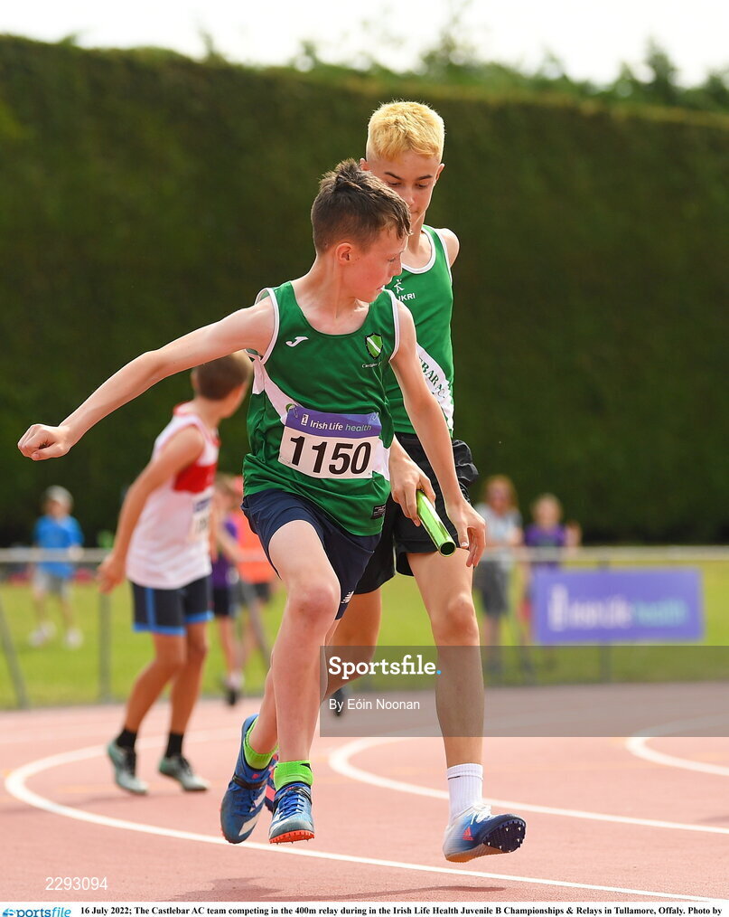 16 July 2022; The Castlebar AC team competing in the 400m relay during in the Irish Life Health Juvenile B Championships & Relays in Tullamore, Offaly. Photo by Eóin Noonan/Sportsfile
