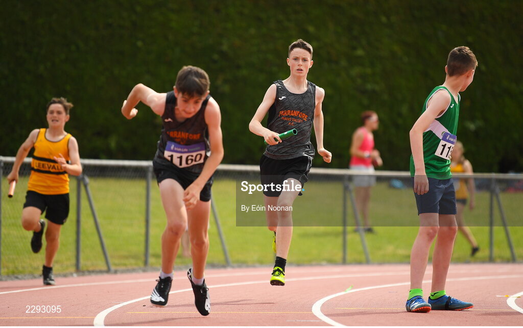 16 July 2022; The Faranfore AC team competing in the 400m relay during in the Irish Life Health Juvenile B Championships & Relays in Tullamore, Offaly. Photo by Eóin Noonan/Sportsfile