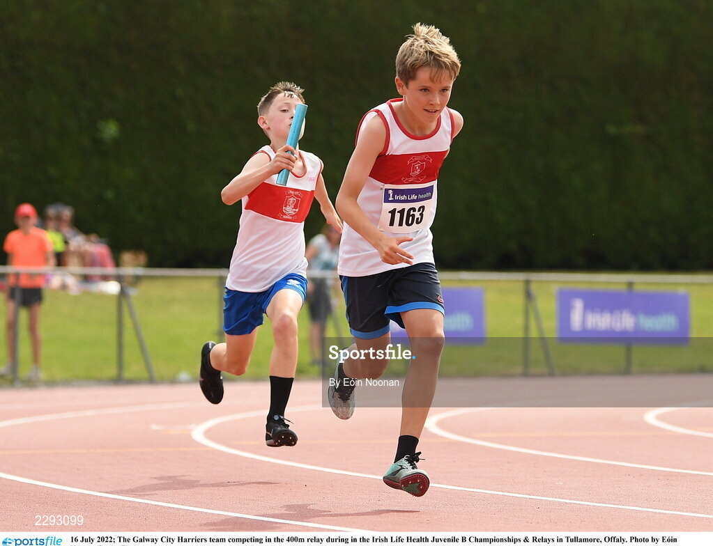 16 July 2022; The Galway City Harriers team competing in the 400m relay during in the Irish Life Health Juvenile B Championships & Relays in Tullamore, Offaly. Photo by Eóin Noonan/Sportsfile