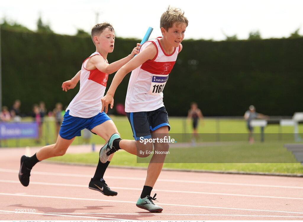 16 July 2022; The Galway City Harriers team competing in the 400m relay during in the Irish Life Health Juvenile B Championships & Relays in Tullamore, Offaly. Photo by Eóin Noonan/Sportsfile