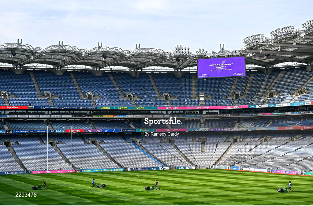 17 July 2022; Ground staff work on the pitch before the GAA Hurling All-Ireland Senior Championship Final match between Kilkenny and Limerick at Croke Park in Dublin. Photo by Ramsey Cardy/Sportsfile