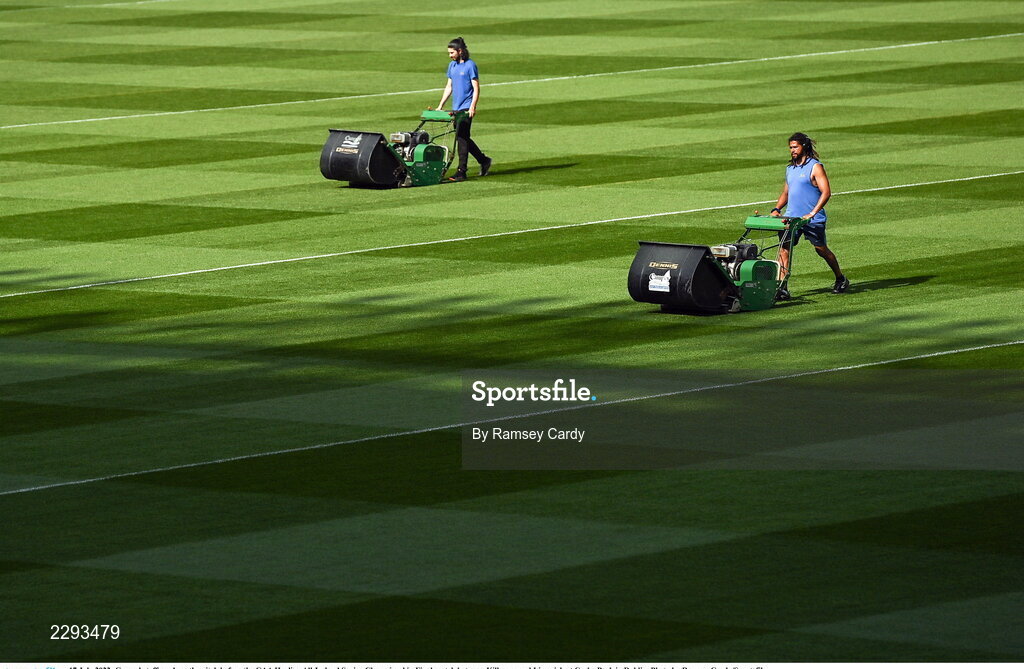 17 July 2022; Ground staff work on the pitch before the GAA Hurling All-Ireland Senior Championship Final match between Kilkenny and Limerick at Croke Park in Dublin. Photo by Ramsey Cardy/Sportsfile