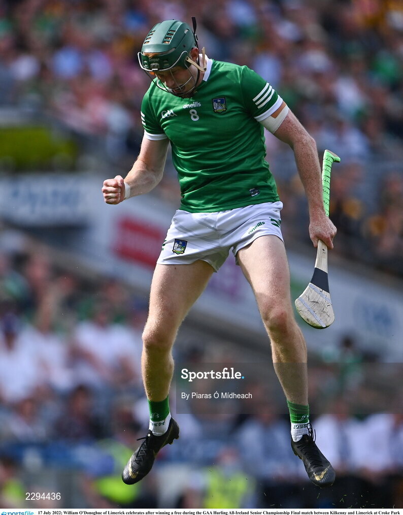 17 July 2022; William O'Donoghue of Limerick celebrates after winning a free during the GAA Hurling All-Ireland Senior Championship Final match between Kilkenny and Limerick at Croke Park in Dublin. Photo by Piaras Ó Mídheach/Sportsfile