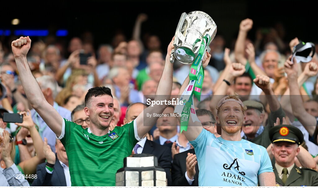 17 July 2022; Limerick captain Declan Hannon, left, and injured Limerick hurler Cian Lynch lift the Liam MacCarthy Cup after the GAA Hurling All-Ireland Senior Championship Final match between Kilkenny and Limerick at Croke Park in Dublin. Photo by Stephen McCarthy/Sportsfile