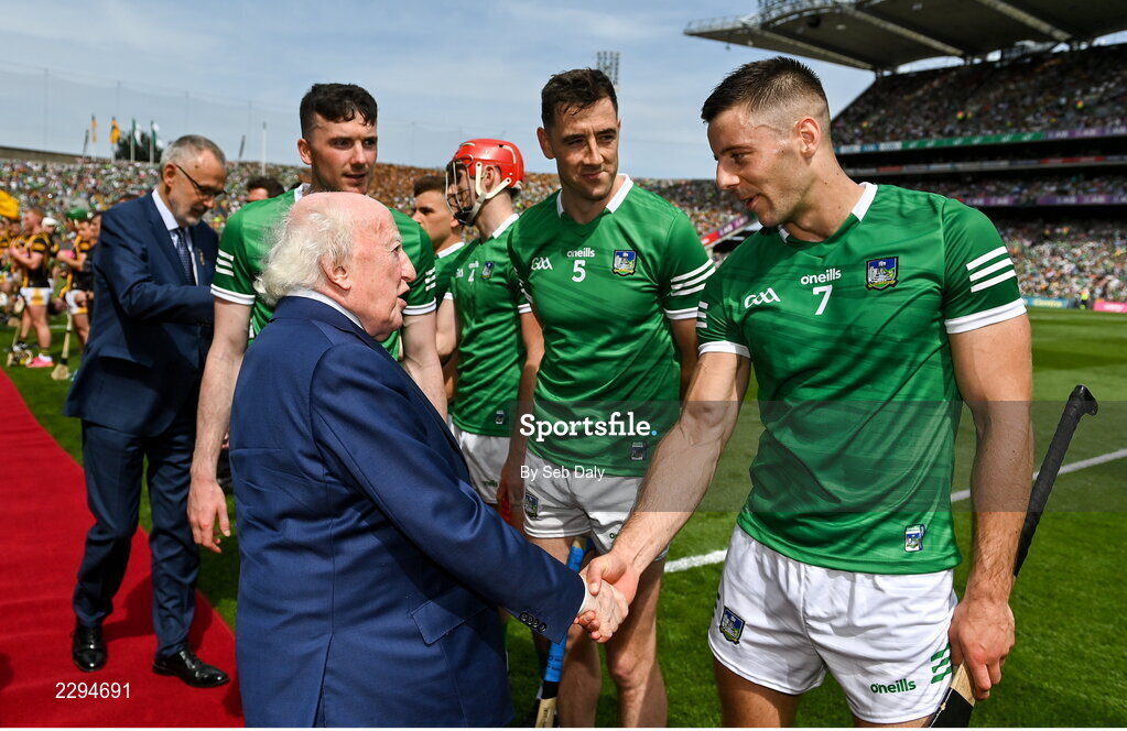 17 July 2022; President of Ireland Michael D Higgins meets Dan Morrissey of Limerick before the GAA Hurling All-Ireland Senior Championship Final match between Kilkenny and Limerick at Croke Park in Dublin. Photo by Seb Daly/Sportsfile