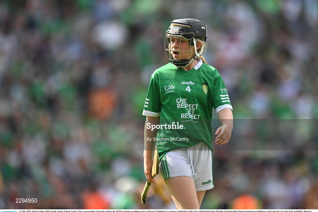 17 July 2022; Katie Conlon, Holy Family Senior School, Ennis, Clare, representing Limerick, during the INTO Cumann na mBunscol GAA Respect Exhibition Go Games at half-time of the GAA All-Ireland Senior Hurling Championship Final match between Kilkenny and Limerick at Croke Park in Dublin. Photo by Stephen McCarthy/Sportsfile