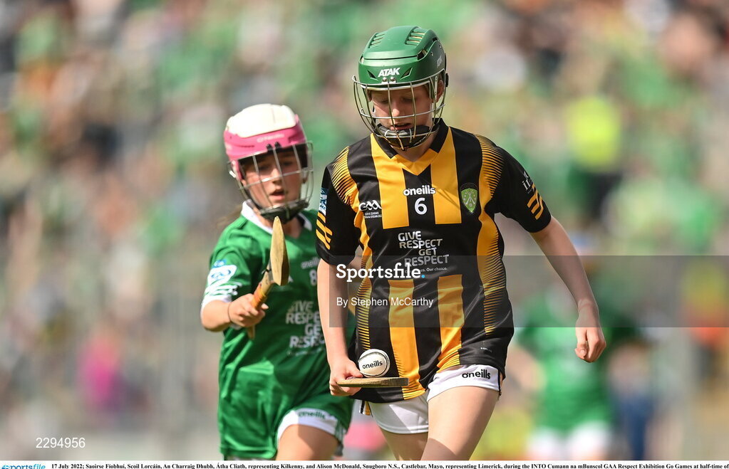 17 July 2022; Saoirse Fíobhuí, Scoil Lorcáín, An Charraig Dhubh, Átha Cliath, representing Kilkenny, and Alison McDonald, Snugboro N.S., Castlebar, Mayo, representing Limerick, during the INTO Cumann na mBunscol GAA Respect Exhibition Go Games at half-time of the GAA All-Ireland Senior Hurling Championship Final match between Kilkenny and Limerick at Croke Park in Dublin. Photo by Stephen McCarthy/Sportsfile