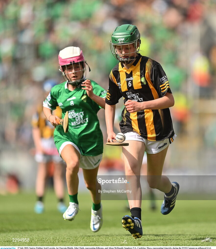 17 July 2022; Saoirse Fíobhuí, Scoil Lorcáín, An Charraig Dhubh, Átha Cliath, representing Kilkenny, and Alison McDonald, Snugboro N.S., Castlebar, Mayo, representing Limerick, during the INTO Cumann na mBunscol GAA Respect Exhibition Go Games at half-time of the GAA All-Ireland Senior Hurling Championship Final match between Kilkenny and Limerick at Croke Park in Dublin. Photo by Stephen McCarthy/Sportsfile
