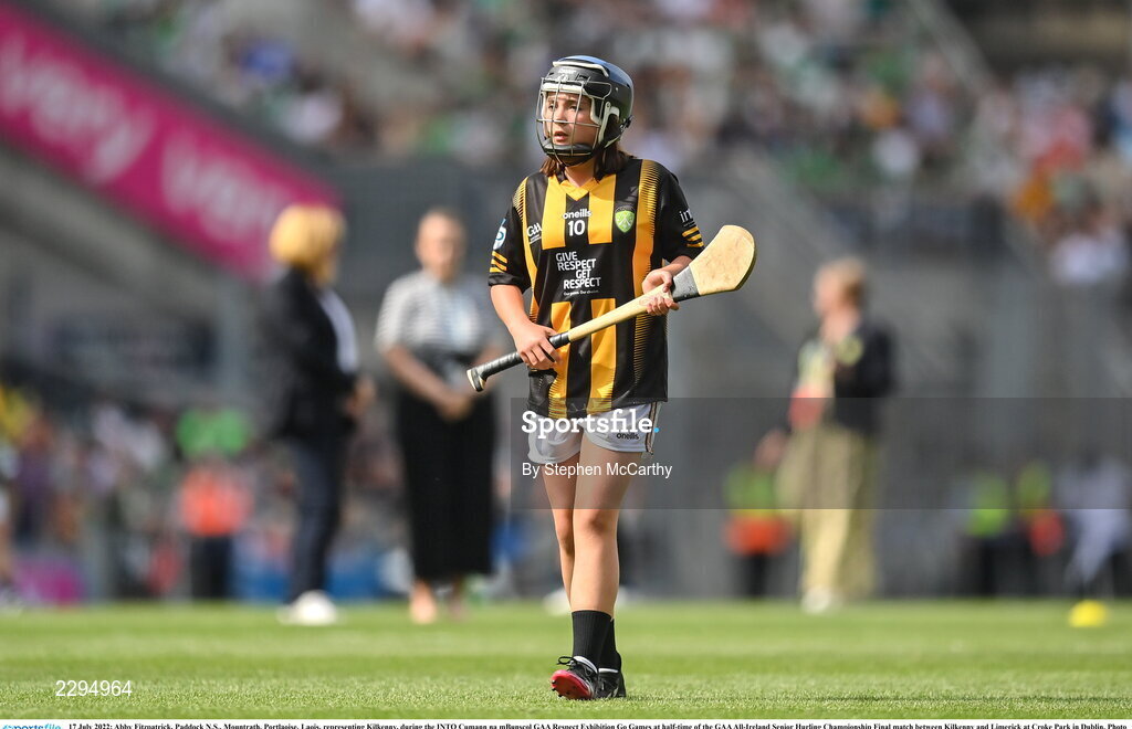 17 July 2022; Abby Fitzpatrick, Paddock N.S., Mountrath, Portlaoise, Laois, representing Kilkenny, during the INTO Cumann na mBunscol GAA Respect Exhibition Go Games at half-time of the GAA All-Ireland Senior Hurling Championship Final match between Kilkenny and Limerick at Croke Park in Dublin. Photo by Stephen McCarthy/Sportsfile