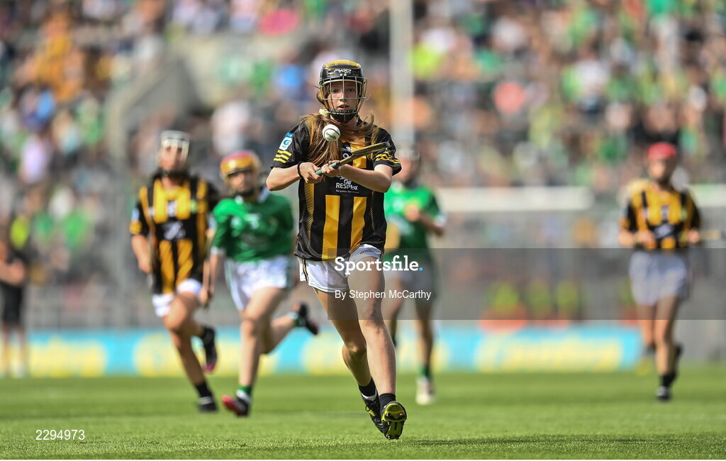 17 July 2022; Rachel Murphy, Scoil Mhoiling N.S., Tullogher, Kilkenny, during the INTO Cumann na mBunscol GAA Respect Exhibition Go Games at half-time of the GAA All-Ireland Senior Hurling Championship Final match between Kilkenny and Limerick at Croke Park in Dublin. Photo by Stephen McCarthy/Sportsfile
